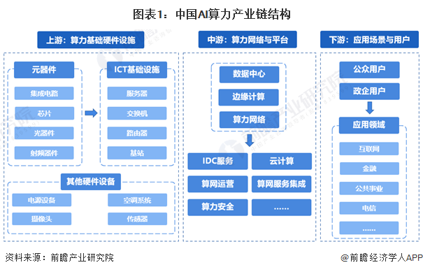 AI算力产业链上游为算力基础硬件设施,主要包括元器件、ICT基础设施、其他硬件设备等。中游为算力网络与平台,上游硬件设备及基础设施共同组成数据中心、算力网络等,提供IDC服务、云计算服务、以及各类算力网络服务等。产业链下游则为应用场景与用户。
