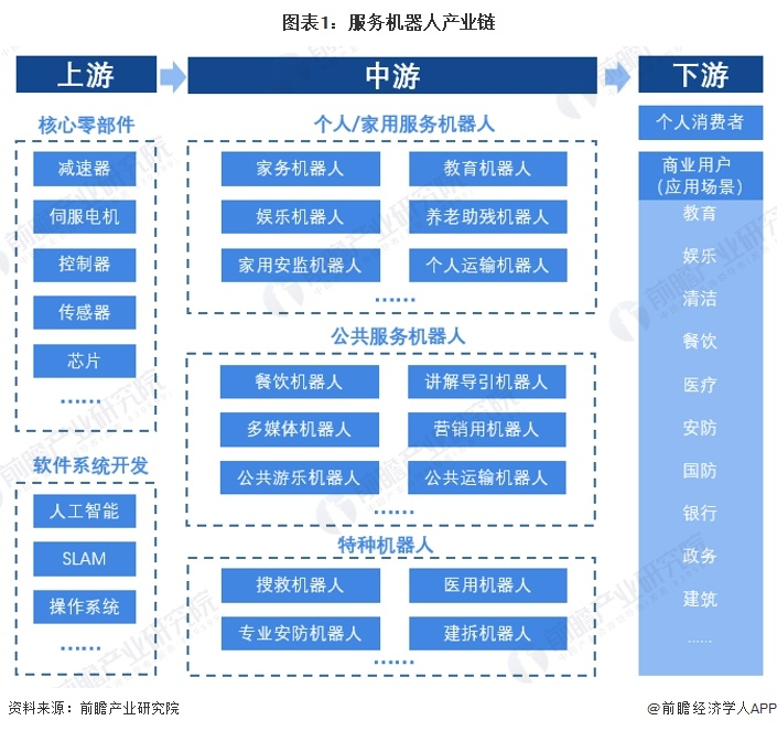 在产业链中游,服务机器人的本体制造主要分为个人/家用服务机器人、公共服务机器人、特种机器人三大类。下游则为教育、娱乐、医疗、清洁、安防、餐饮、消防等应用场景用户以及个人消费者。