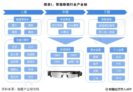 智能眼镜产业链的上游为眼镜零部件以及关键元器件;中游为系统集成以及终端制造;下游主要为不同智能眼镜的销售渠道以及应用场景。