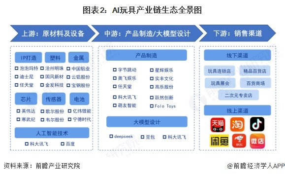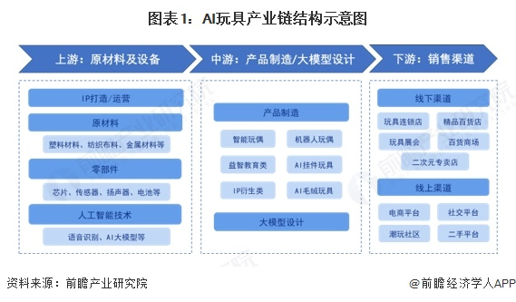 AI玩具产业链上游为原材料及软硬件供应,原材料为制作玩具所需材料包括金属材料、纺织布材料、塑料等;硬件包括芯片、传感器、电池等;软件包括语音识别、AI大模型等人工智能技术。产业链中游为AI玩具产品的设计和制造以及大模型设计环节,主要包括智能玩偶、机器人玩具、AI毛绒玩具、AI动漫IP玩具、AI挂件玩具等。下游为产品的销售环节,包含线下零售渠道和线上电商平台等。