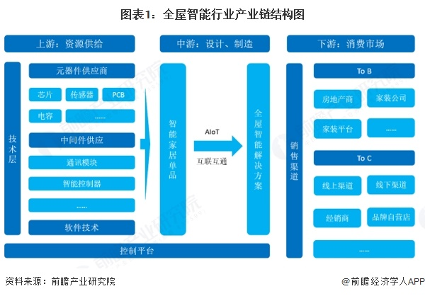 当下,全屋智能领域已逐步形成了一套完整的产业链图谱。产业上游主要由研发芯片的元器件供应商、中间件供应商、以及软件技术供应商组成;随着AIoT进入产业发展期,加之供应链上下大力推进互联互通,智能家居行业迈向全屋智能时代,中游全屋智能家居品牌商可以通过线上、线下零售渠道直接向C端用户销售终端产品,也可以面向地产企业、家装公司等B端客户提供整体的解决方案。